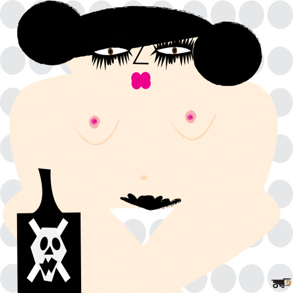 Digital illustration of a nude woman with a bottle of booze on a background of grey polka dots