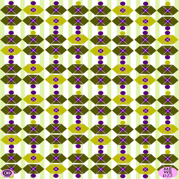 Print composed of green colored hexagons  printed with lavender crosses; purple and green colored dots on a bed of mint green stripes.