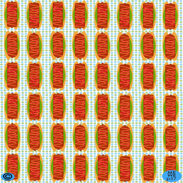 A print of hot dogs on a bed of blue and green polka dots