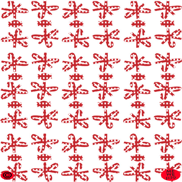 A print of alternating rows of several intersecting candy canes and wrapped candies.